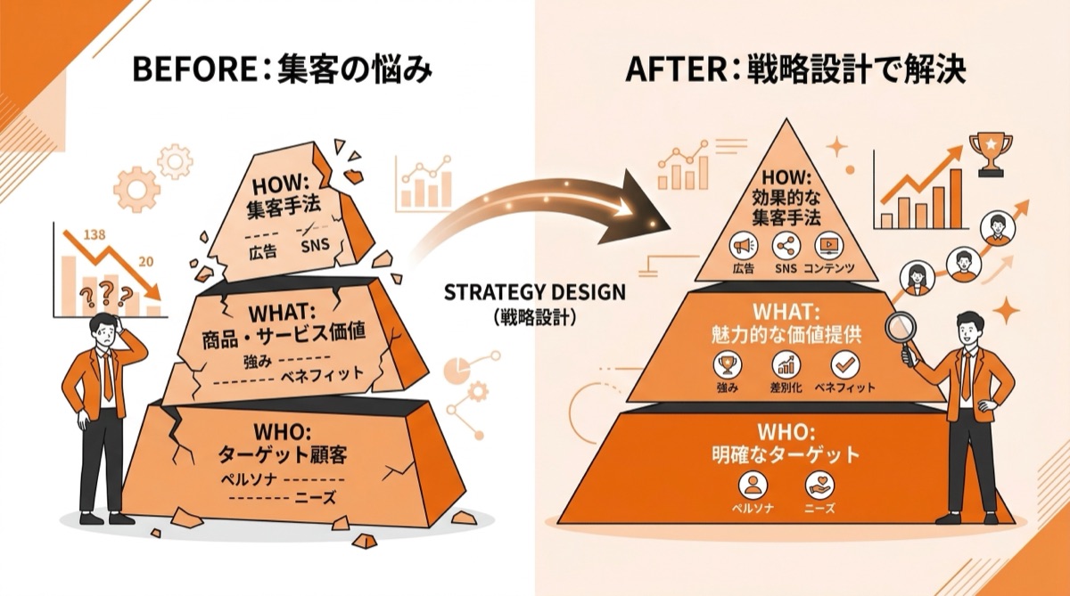 この記事では、集客が改善しない5つの根本原因を「WHO(誰に)・WHAT(何を)・HOW(どうやって)」の3層構造で整理し、今日から見直せる具体的なステップを解説します。